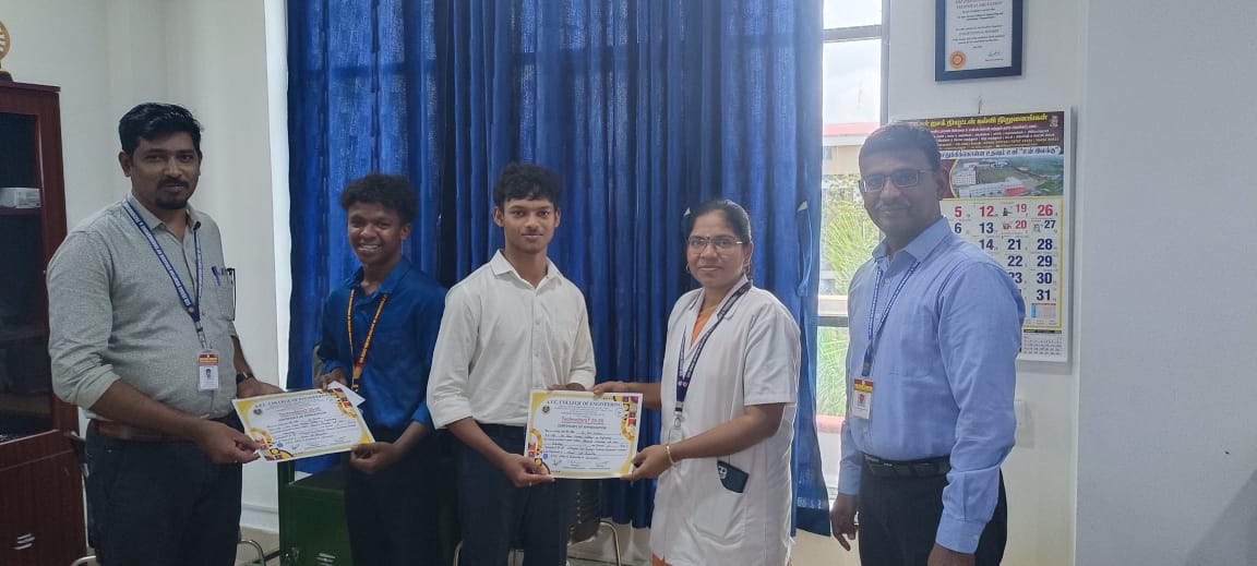 Department of IT: K. Gunadharshini, R. Kiruthika, and A. Arunjoseph (III Year) won 2nd Prize in Paper Presentation at Savitha Engineering College, Chennai.