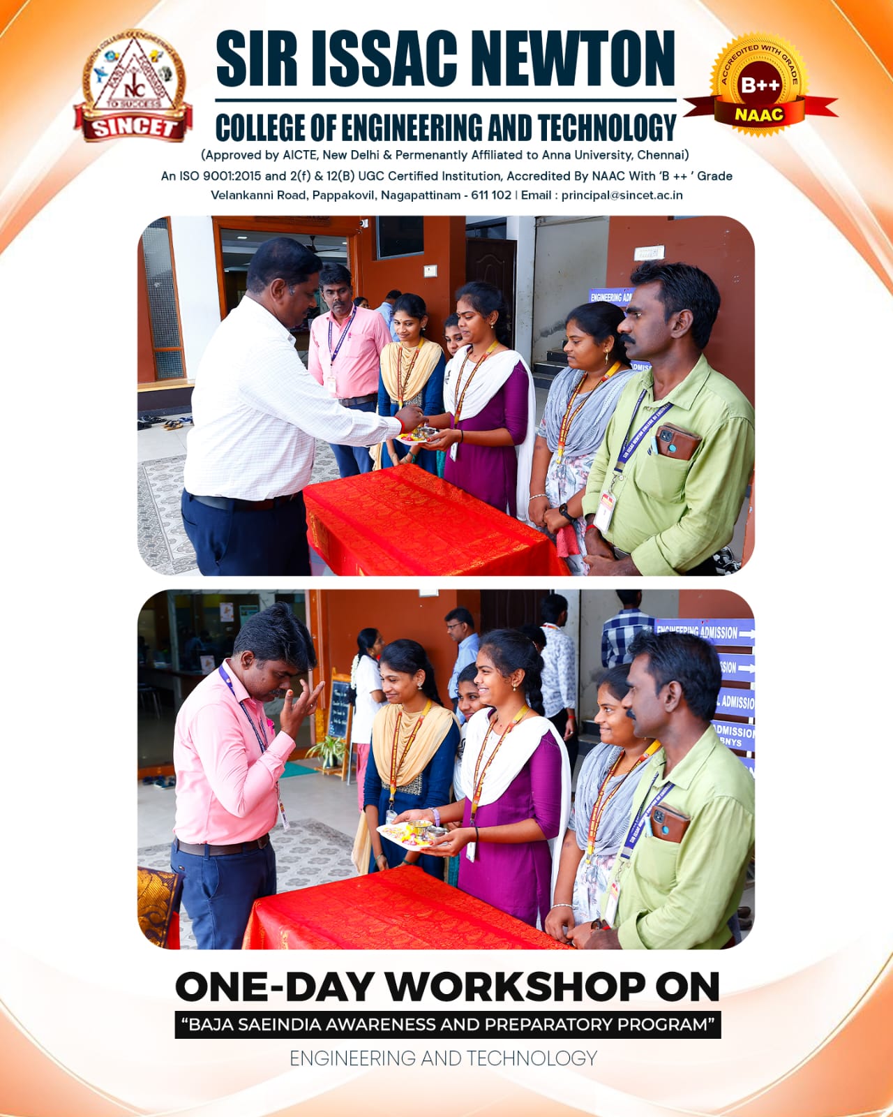 A One-Day Workshop on “BAJA SAEINDIA Awareness and Preparatory Program” was organized by the Departments of Mechanical and Agricultural Engineering at Sir Issac Newton College of Engineering and Technology, Nagapattinam, on 11th October 2025.