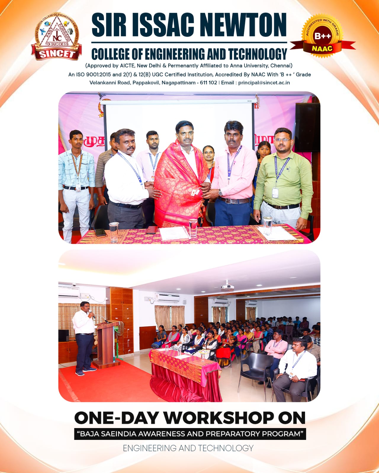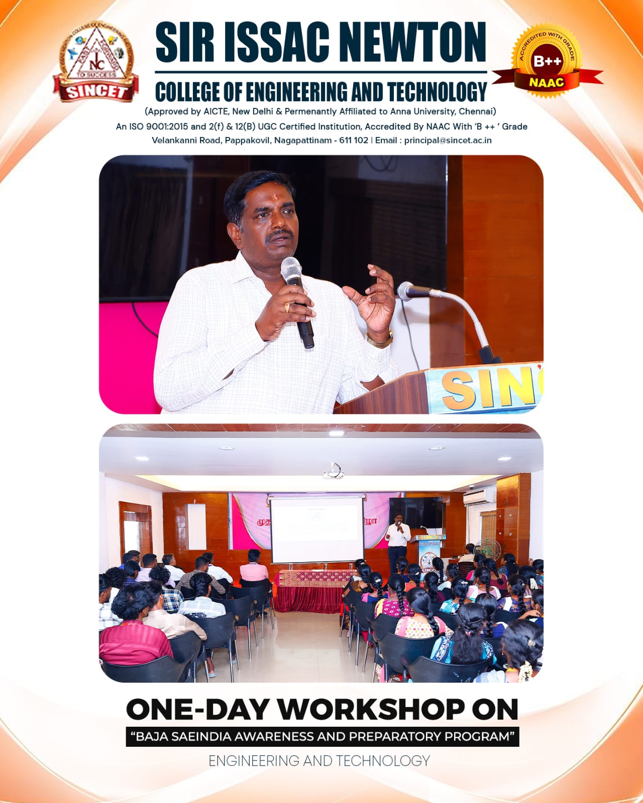 One-Day Workshop on “BAJA SAEINDIA Awareness and Preparatory Program” at SINCET A One-Day Workshop on “BAJA SAEINDIA Awareness and Preparatory Program” was organized by the Departments of Mechanical and Agricultural Engineering at Sir Issac Newton College of Engineering and Technology, Nagapattinam, on 11th October 2025. The workshop aimed to create awareness and enthusiasm among students regarding the BAJA SAEINDIA event and to prepare them for active participation in the competition. The Resource Person for the program was Dr. T. Prabakaran, Professor, Department of Mechanical Engineering, Meenakshi Sundararajan Engineering College, Chennai, who also serves as the SAE Club – BAJA Coordinator and Innovation & Incubation Mentor. The session began with a warm welcome address by Mr. P. Malaiselvaraja, Head of the Department of Mechanical Engineering, SINCET. Dr. T.Arunkumar, Director – Training & Placement, Sir Issac Newton Educational Institutions, delivered an insightful speech on the importance and benefits of SAEINDIA for engineering students. During the technical session, Dr. T. Prabakaran elaborated on the objectives, design process, and participation procedures of the BAJA SAEINDIA competition. He motivated the students with real-time examples and success stories of student teams who have excelled in BAJA events. His inspiring words increased students’ interest and confidence to take part in future BAJA competitions. The event concluded with a vote of thanks proposed by Dr. B.Silamparasan, IQAC Coordinator. The workshop witnessed active participation from students of both Mechanical and Agricultural Engineering departments, along with faculty members, department heads, the Principal, the Director and both department SAE club staffs and students coordinaters, session proved to be highly informative and motivational, successfully igniting the spirit of innovation and teamwork among the young engineers.